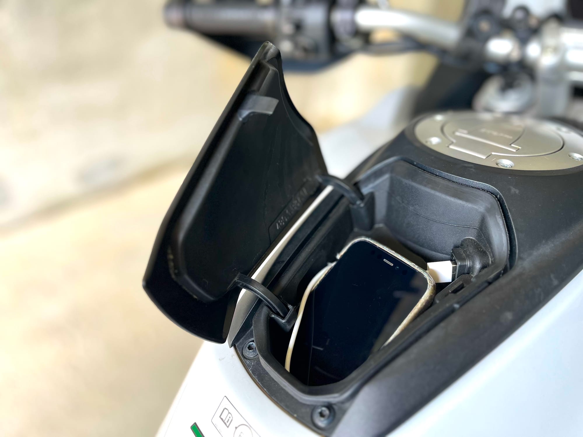 Norint, Ducati turi savo programėlę. Ją suinstaliavus į telefoną kartu su dar viena žemėlapių programėle, telefoną galima slėpti dėtuvėje ant bako su pakrovimo lizdu, o maršrutas rodomas motociklo prietaisų skydelyje. Mes nenorėjome.