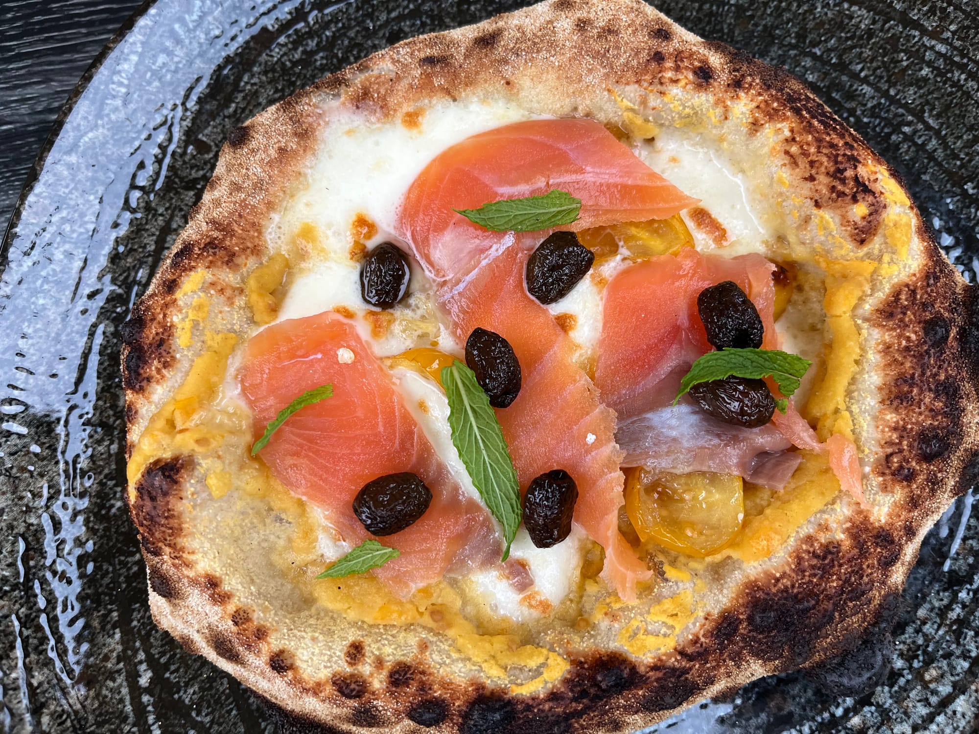 Vakare motociklu nusileidome į šiuolaikinės picos restoraną, užsisakėme itin sotų degustacinį meniu. Čia mus užklupo liūtis su žaibais. Pylė kaip iš kibiro, o mes jaukiai sėdėdami po stogeliu valgėme vieną geriausių desertų pasaulyje. Kaip ir visa kita, skoniai priklauso nuo aplinkybių. Liūtis nuslinko Šveicarijos link, palikdama mums šlapią serpantiną ir juo šmirinėjančias, naktyje blizgančias lapiukų akis.