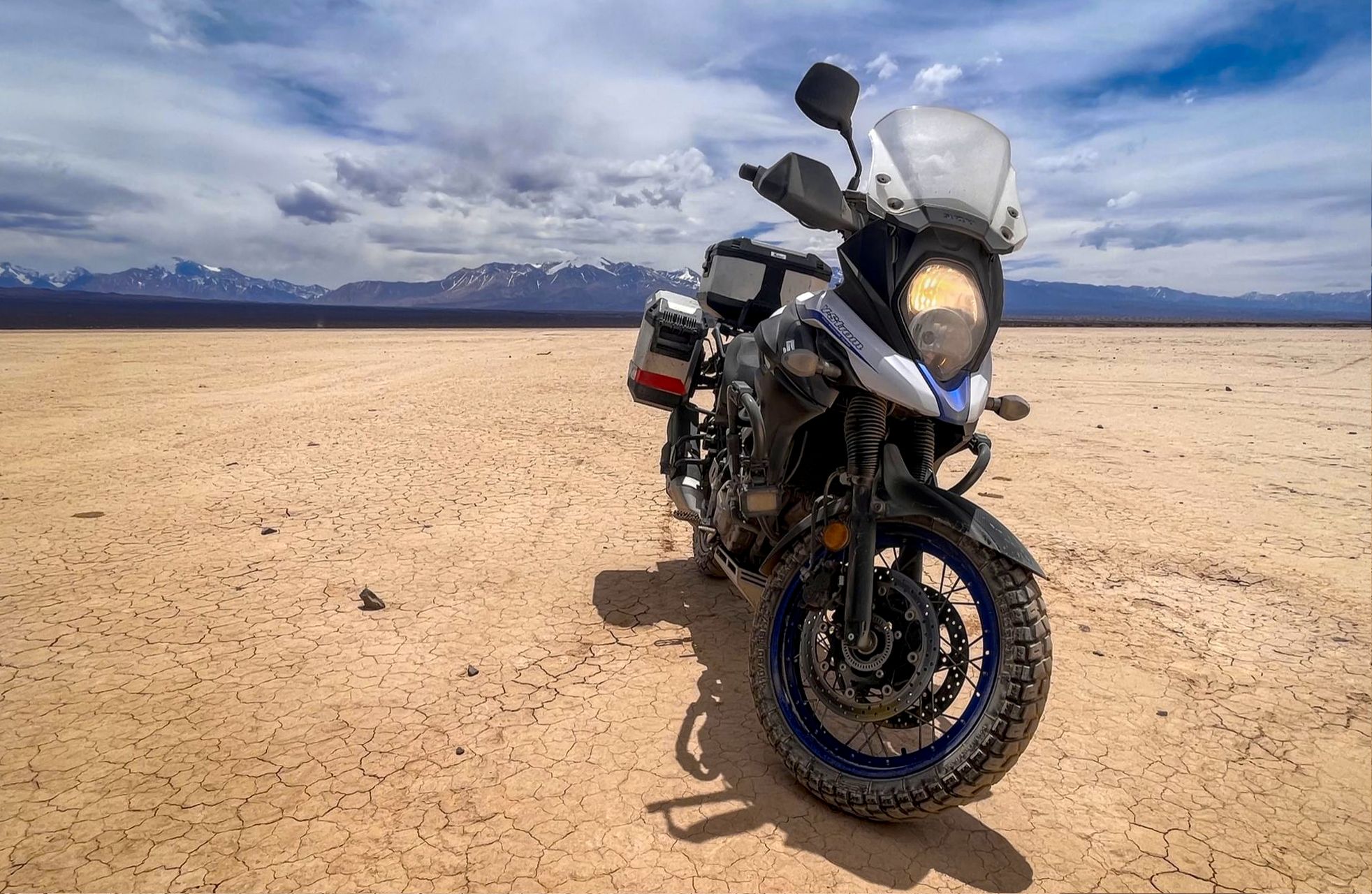 Kiek pavažiavę neiškenčiam ir nuo asfalto įšokam į išdžiuvusio ežero dugną. Iš pat pradžių jis mums pasirodė panašus į druskos dykumą tik su nestabiliu gruntu (dėl to nusprendėm greičio rekordo nesiekti). Vėliau įsitikinom, kad šis ežero dugnas, palyginti su mūsų patirtomis druskų dykvietėmis, buvo švelnus kaip vikunijos vilnos šalikas.