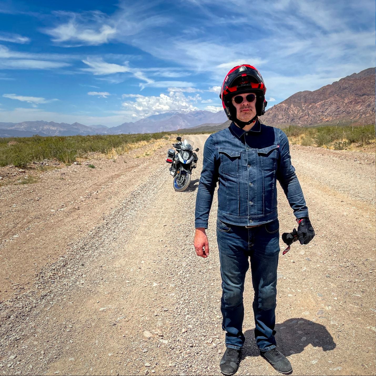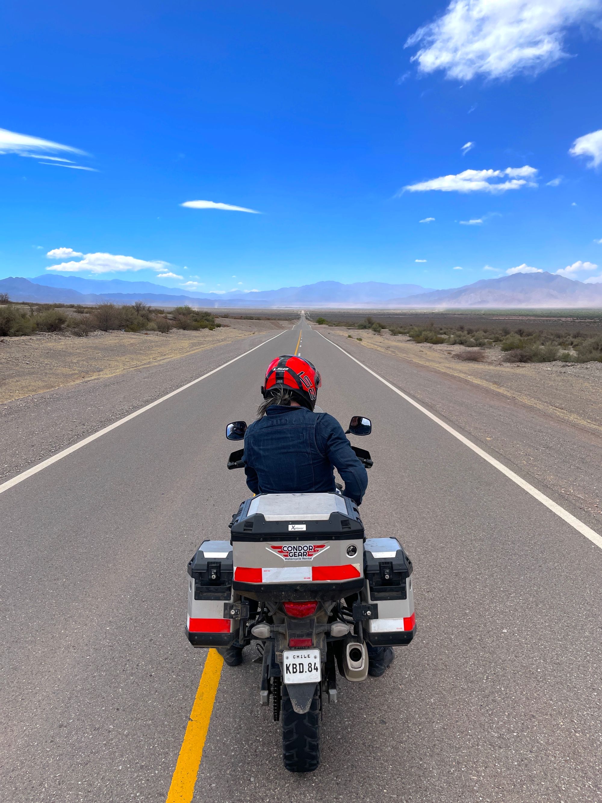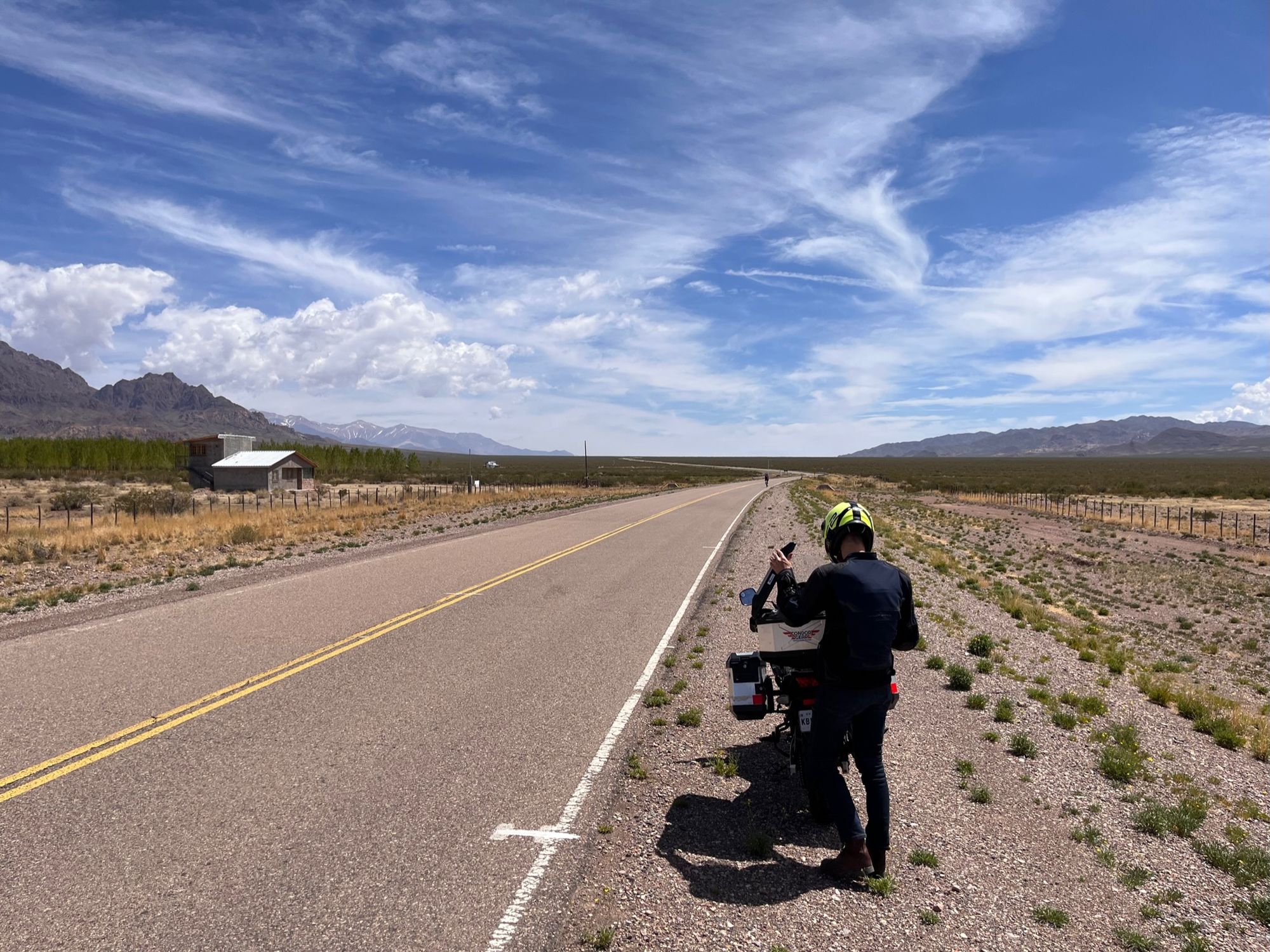 Tvarkingai (itin lėtai), stoviniuodami pasigrožėti šalikelėse besiganančiais gvanakais, atsipurtėm daugiau kaip trisdešimt kilometrų, o tada žvyrkelis baigėsi taip pat netikėtai kaip ir prasidėjęs. Prasideda gražiausias kada nors matytas asfaltas per krūmpalaikiais nusėtą lygumą, iš abiejų pusių įrėmintą tolimų kalnų. Taip, geriau negu tas instagraminis prieš tai. Ant tiek E-M-E-I-Z-I-N-G-L-U, kad Rimas nuo įspūdžių pertekliaus važiuodamas rėkė į šalmą (jugi šūdas, o ne pasivažinėjimas mocu, jeigu net į šalmą neparėki iš džiaugsmo). Doncė, nuo pat pradžių itin skeptiškai žiūrėjęs į droną kelionėje kaip balastą ir kaip laukiančią darbo priemonę, visgi pasiūlė jį išsitraukti ir tą kelią užfiksuoti iš viršaus. Štai kas gavosi: