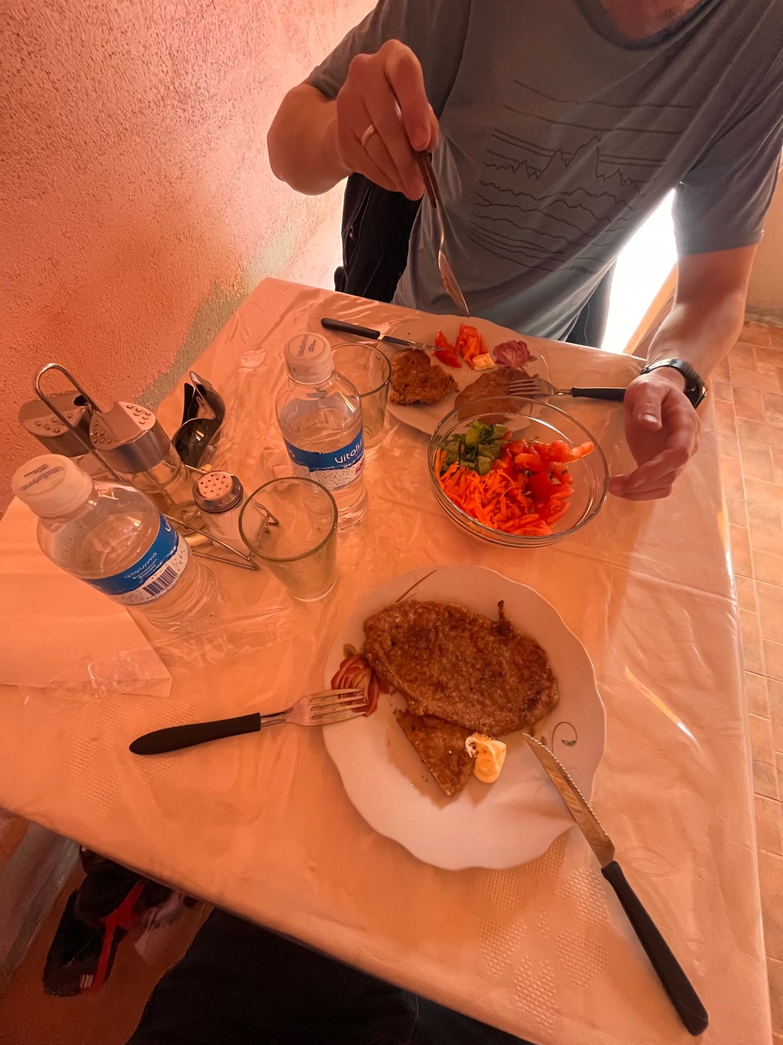 Vakarienė dviems Las Flores: 19€. Šeimininkė pati negamino vakarienės, bet pasiūlė užsisakyti maistą į namus. Per pusvalandį atvažiavo dvi lėkštės karštų cannelloni ir bent pora litrinių butelių šalto alaus.
