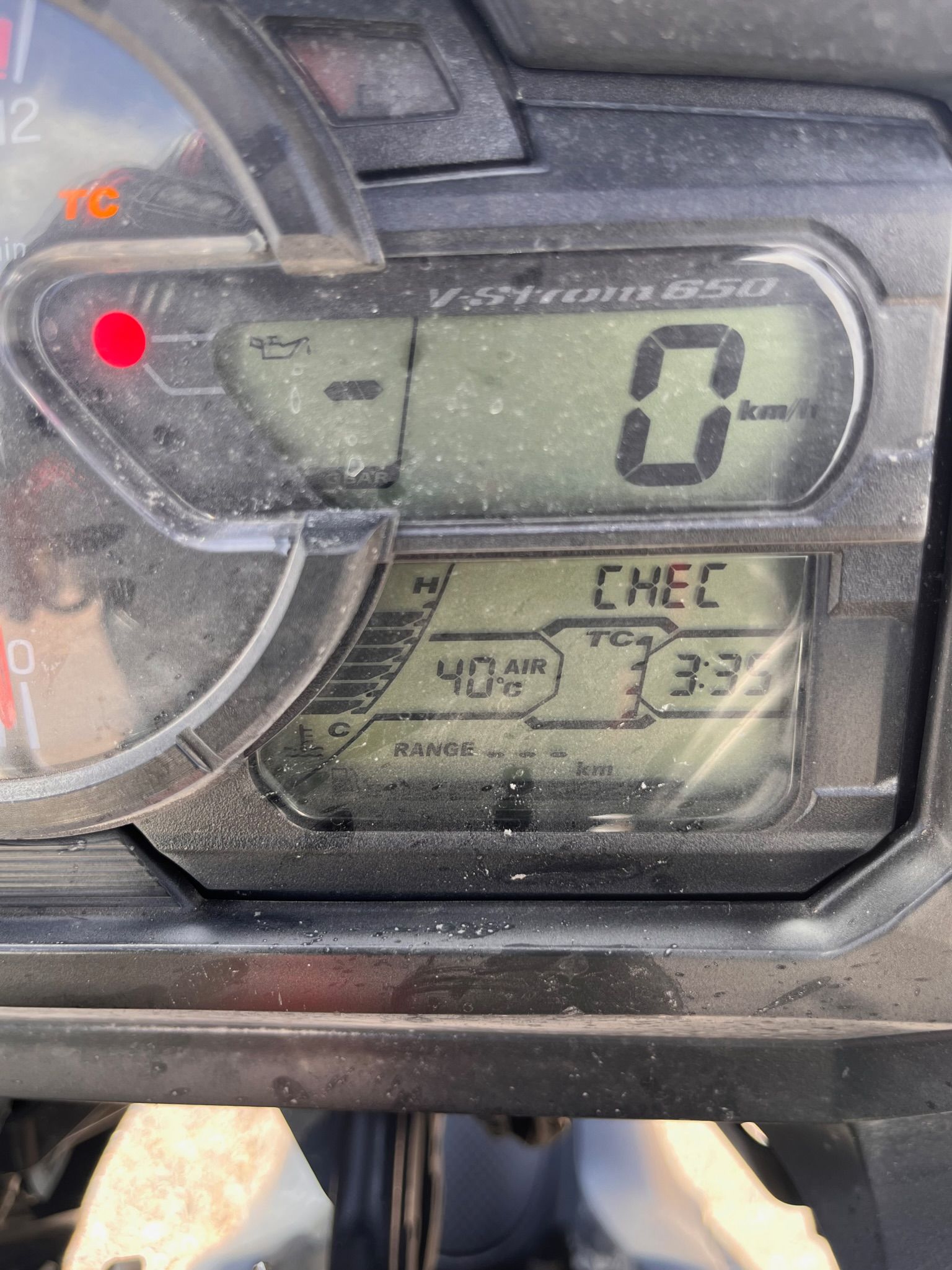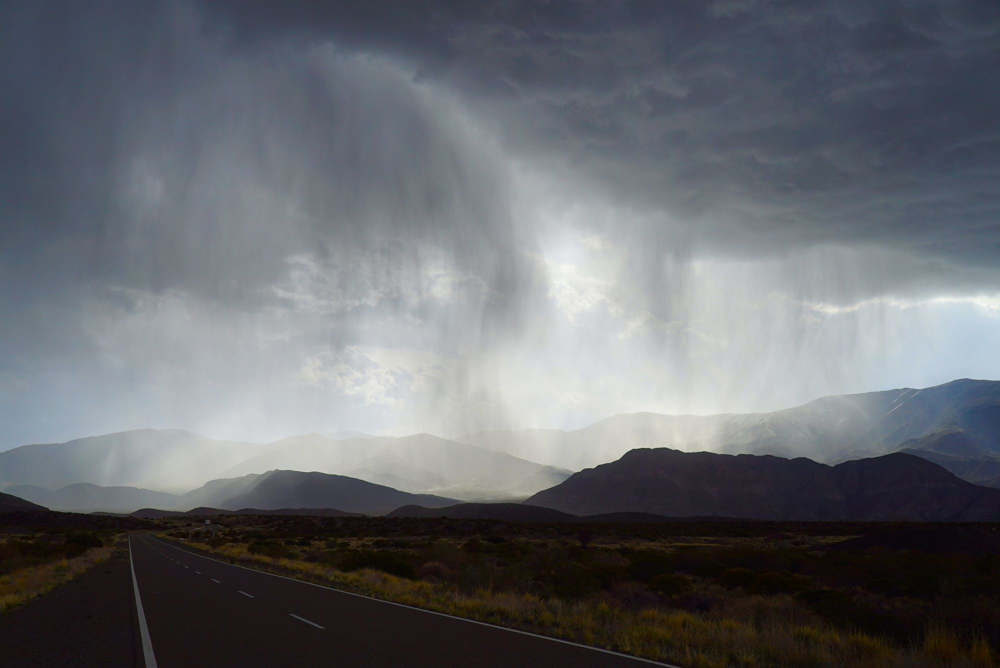 Gaudom sau motociklus po kelią, priešinamės šoniniam vėjui, stengiamės neužvažiuoti ant posūkiuose pabirusių akmenukų ir tada bloškiamės į lietaus sieną. Jau kuris laikas su nerimu stebėjom kalnuose besikaupiančius debesis svarstydami ar geltonoji skiriamoji juosta nuves būtent į juos. Pagaliau lubos įlūžo ir iš antro aukšto pasipylė krioklys kartu su akinančia nuo šlaitų atsispindinčia saulės šviesa. Temperatūra nuo +33C nukrito iki +13C. Ką daryti kai lyja ten, kur nėra stogo virš galvos, žinojom: stipriau sukom rankeną ir džiaugėsi tie, kurie laiku spėjo apsivilkti lietaus aprangą (Donatas). Tie kurie nespėjo (Rimas) - drėko ir stengėsi smarkiai nekalenti dantimis.