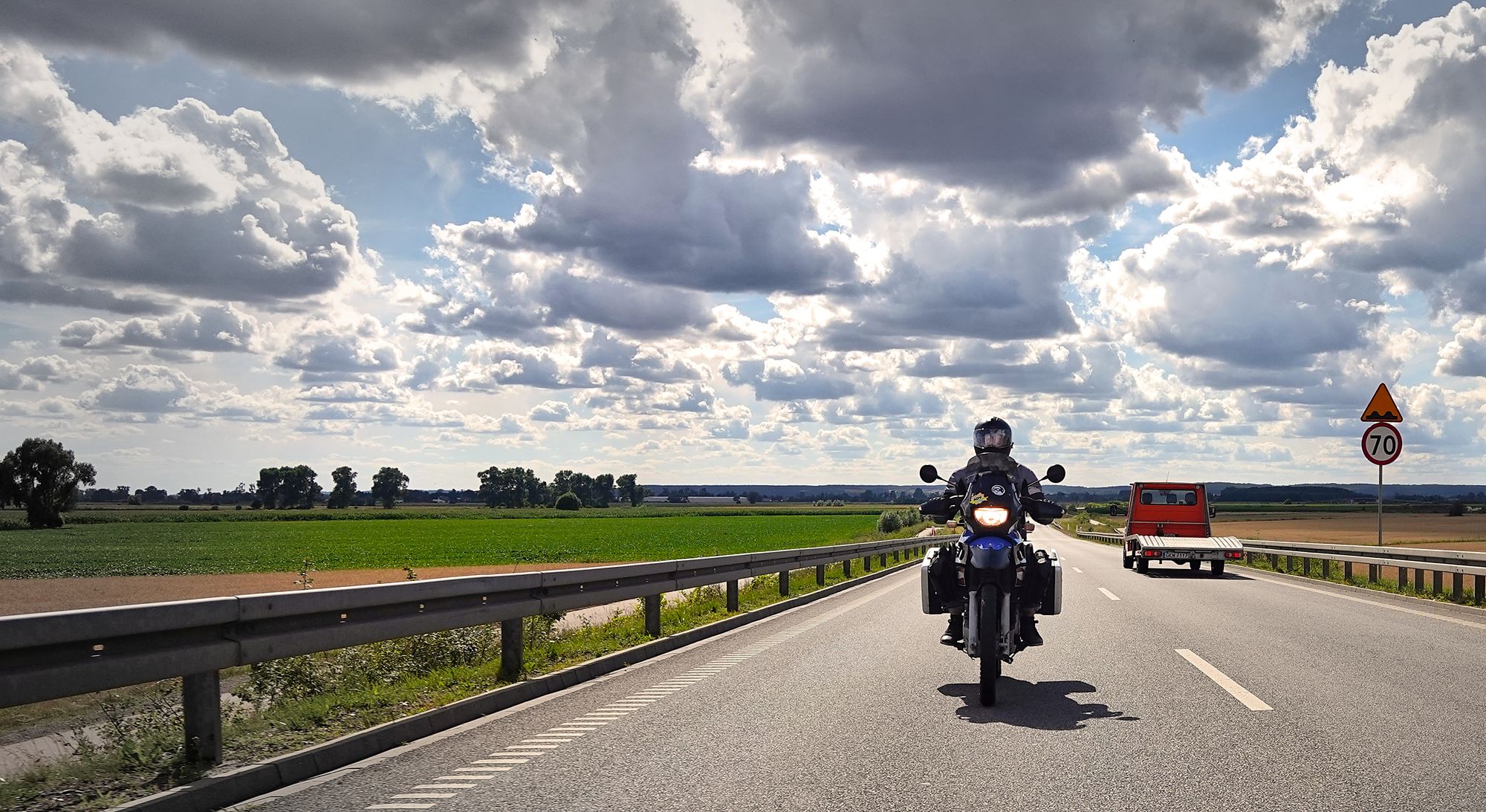 Mūsų nakvynė turėjo būti viloje Evia. Visų pirma, nėra jokios vilos. Yra tik penkių aukštų daugiabutis smailiu stogu, pačiame skruzdėlyno centre. Ten kokios 7 vilos. Per langą iš mūsų juokiasi pripučiamas Pimpačkiukas, kala bumčikas, blyksi apžvalgos ratas. Keturviečiame kambaryje yra trys lovos, ant didžiausios ne daugiau nei 1,2 metro pločio padėtos dvi pagalvės, suprask dvigulė. Vėl susinešu savo šmutkes atgal ant motociklo užsidedu tolimiausią tašką šitame siaube ir po pusantro kilometro prisiparkuoju kempinge. Sutelkiu visas savo lenkų kalbos žinias: